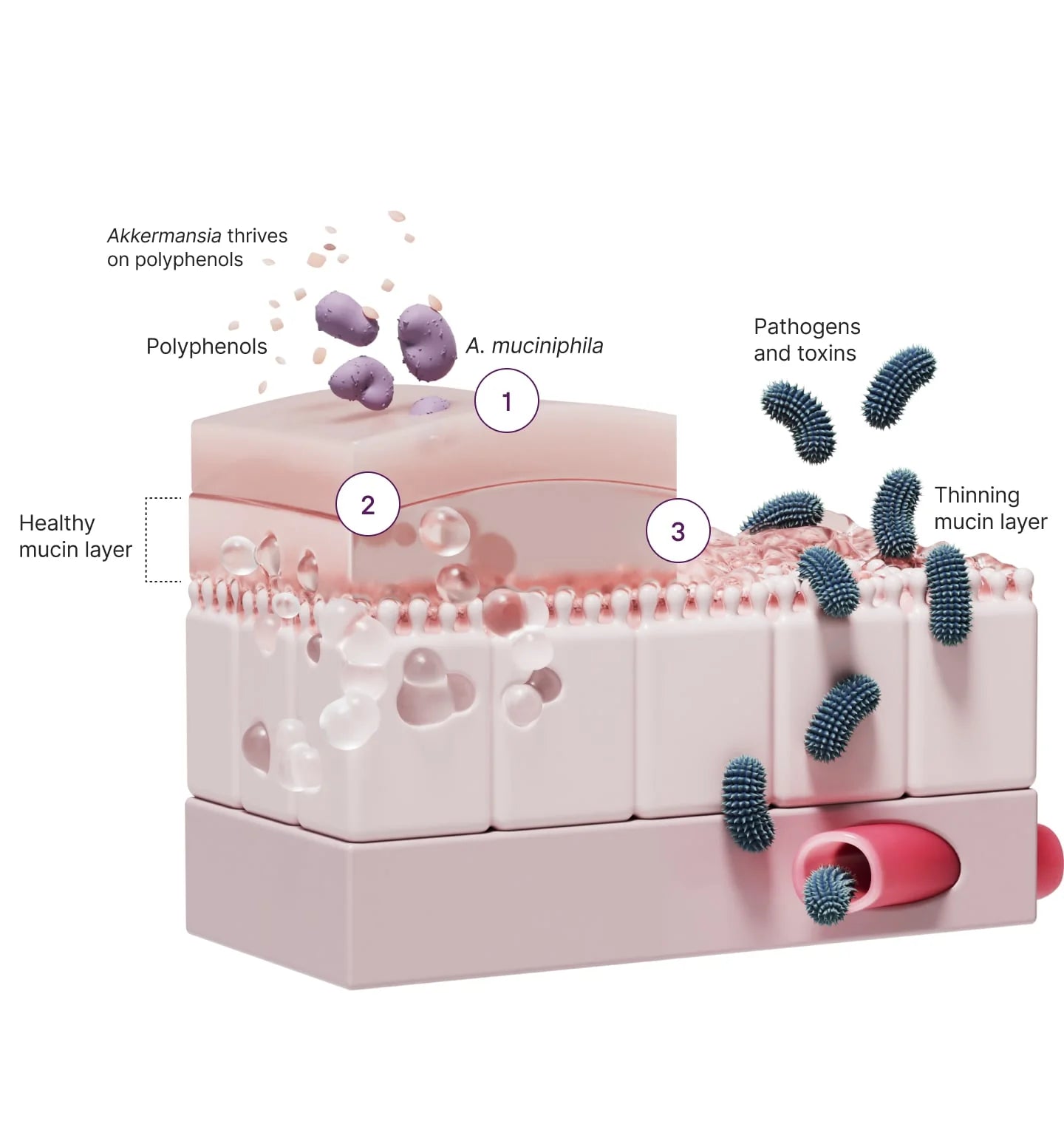 Replenish your gut barrier with live Akkermansia, a probiotic strain essential for gut health.